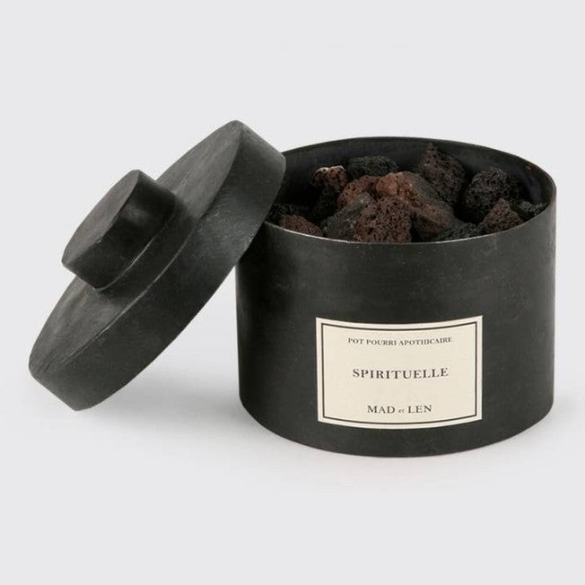 Håndlaget i de franske alpene, Mad et Len presenterer et eksklusivt potpurri-konsept bestående av lavasteiner i en skulpturell svart smidd boks.