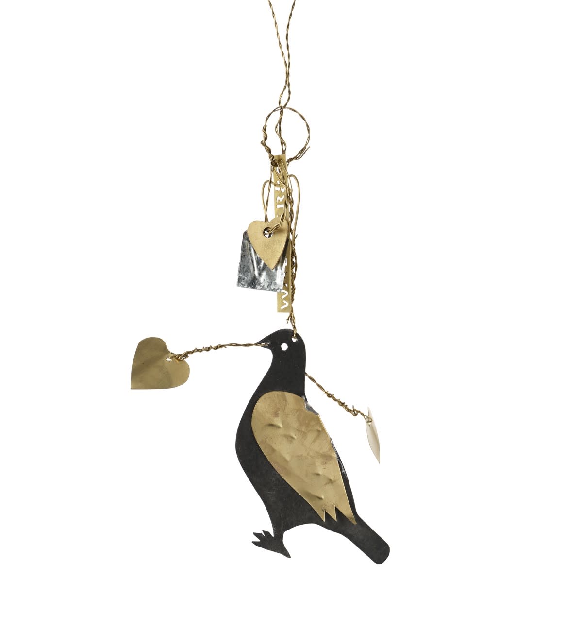 Delikat og full av mening, denne håndlagde pynten viser en due med en kvist og to hjerter i nebbet. Laget i gråtonet metall med detaljer i varm messingfinish, balanserer den rustikk sjarm med elegant raffinement. Den passer perfekt til å henge på juletreet, i et vindu eller som en dekorativ detalj gjennom hele året.