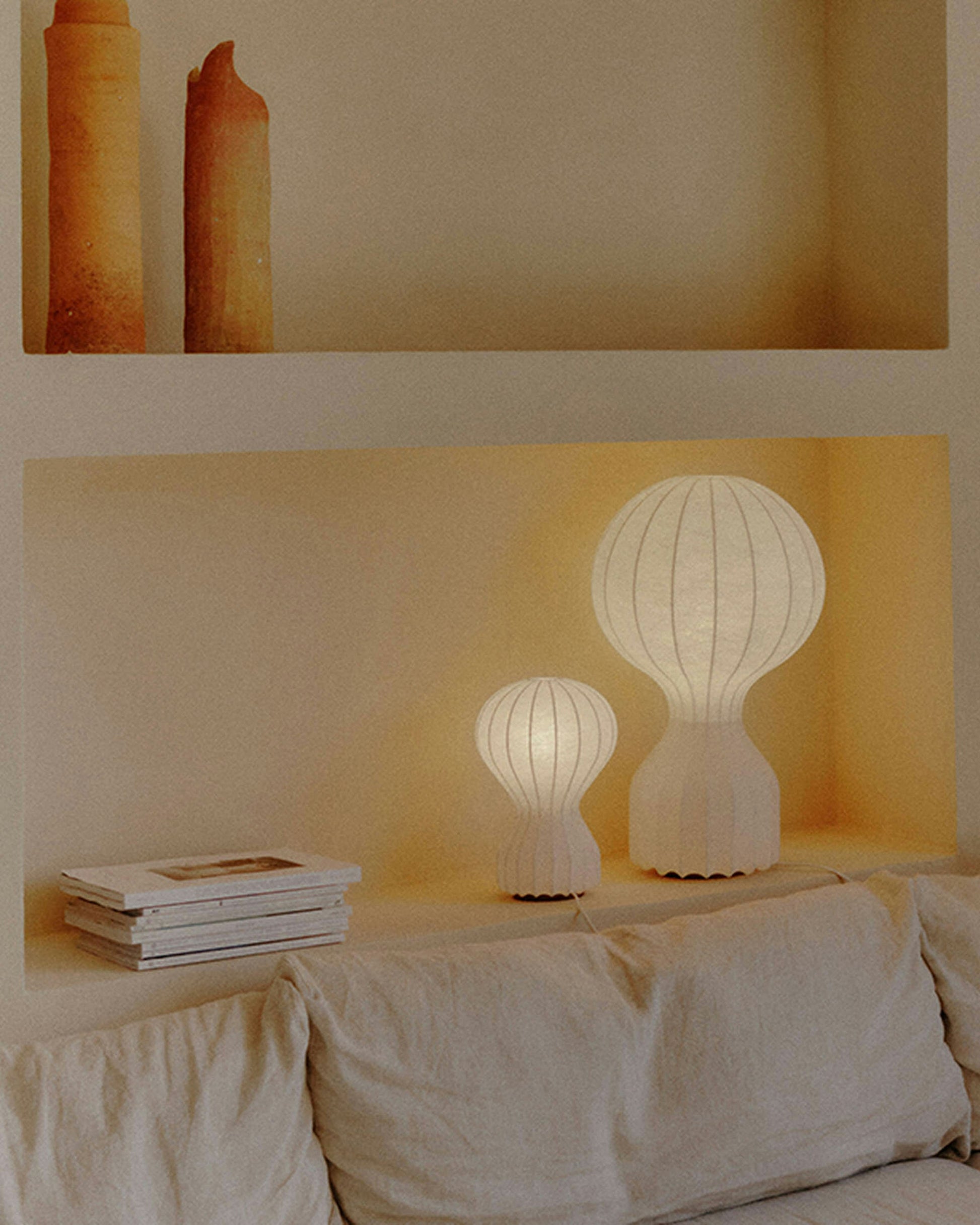 Bordlampe som gir diffust lys. Hvit pulverlakkert innvendig stålstruktur sprayet med en unik "kokong"-harpiks for å lage diffuseren, som deretter er beskyttet av en gjennomsiktig sprayet overflate. På ledningen er det en elektronisk dimmer som gjør det mulig å regulere lysstyrken.