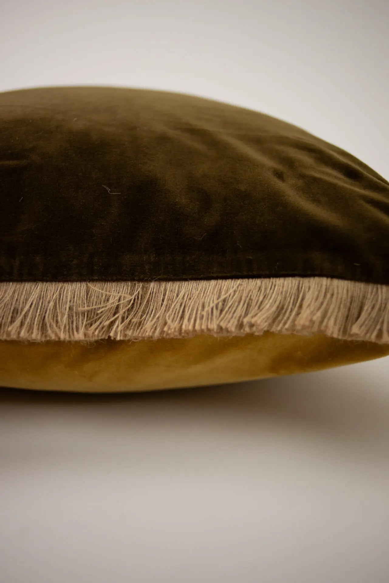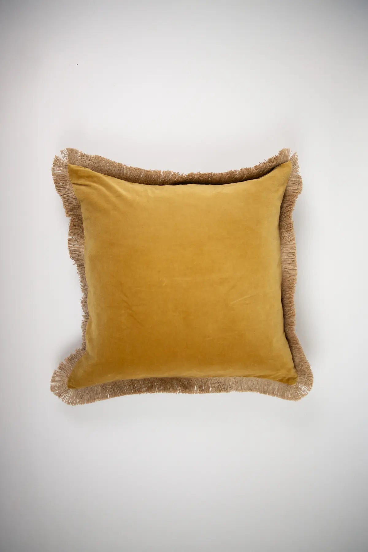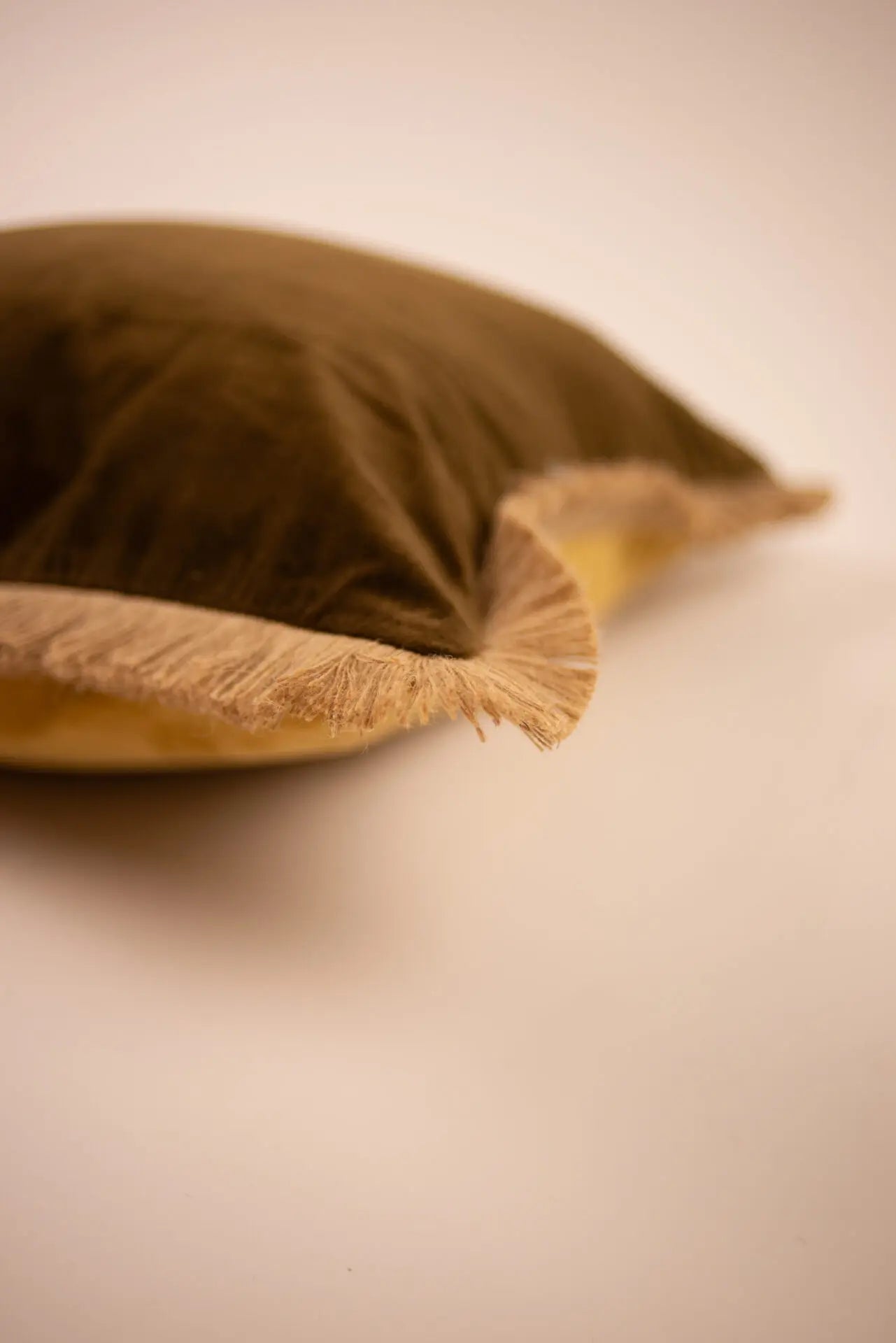 Vakkert putetrekk i bomullsfløyel i kontrastfarge, med jutefrynser.