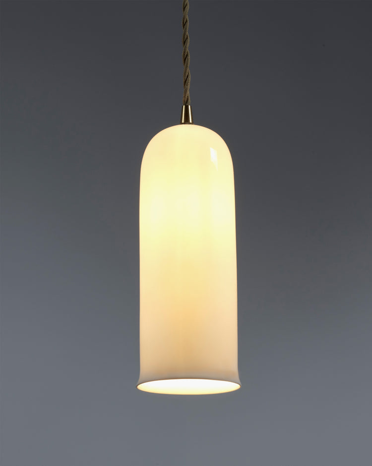 Den hvite pendellampen «Olympia n°2» er laget av delikat porselen. Messingdetaljer og luksuriøse gullfargede ledninger gir et ekstra preg av eleganse. Den håndlagde kuppelformede skjermen er tidløs.
