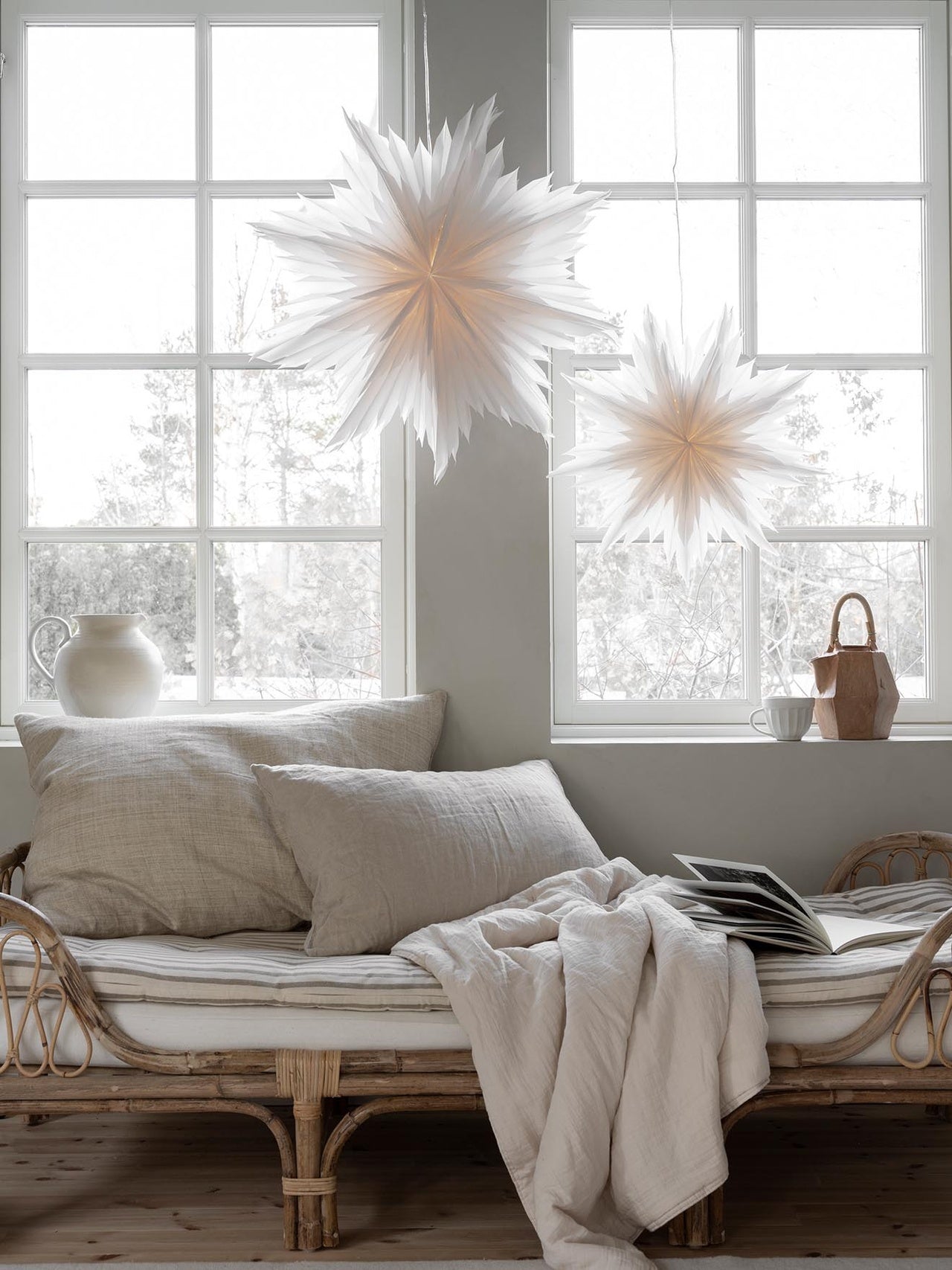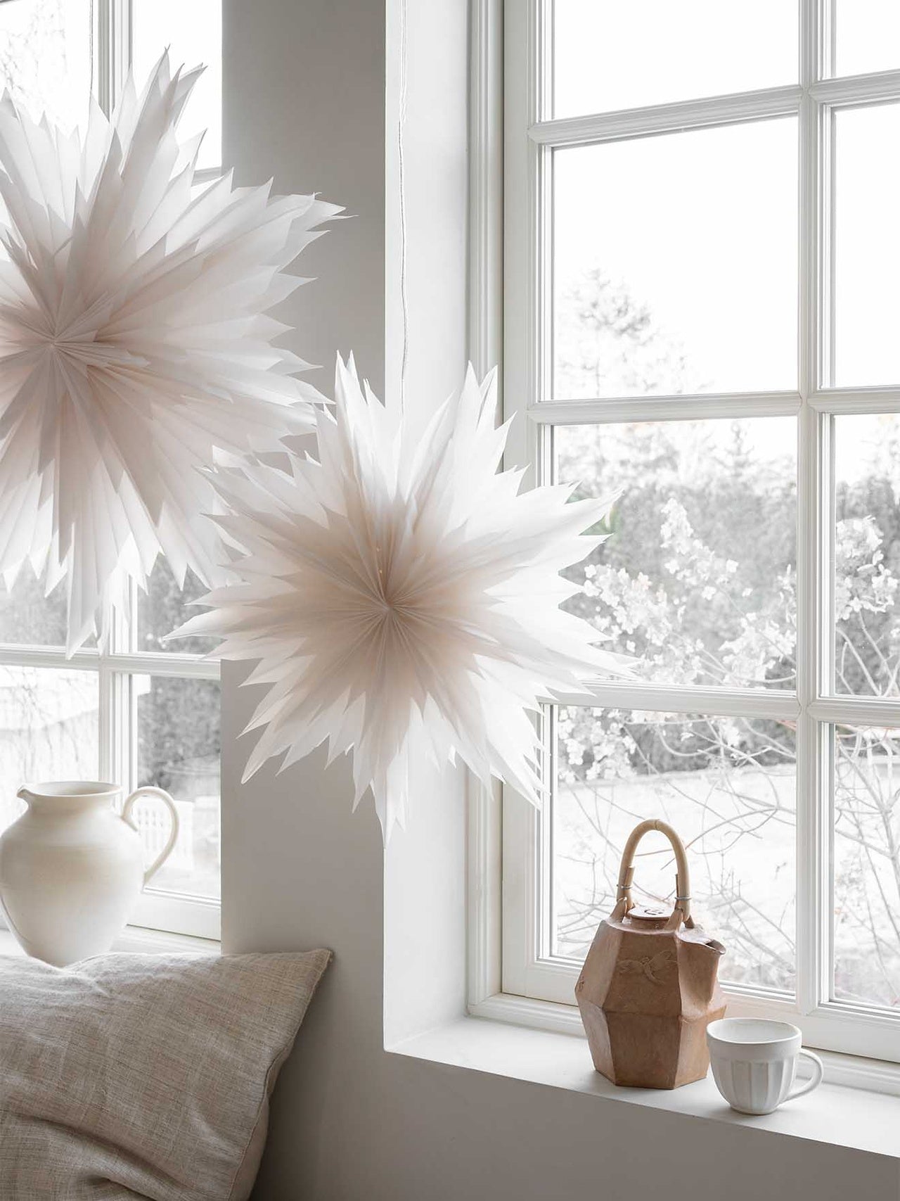 Hver stjerne er håndlaget av halvtransparent papir av høyeste kvalitet, og leveres i en elegant hvit gaveeske.