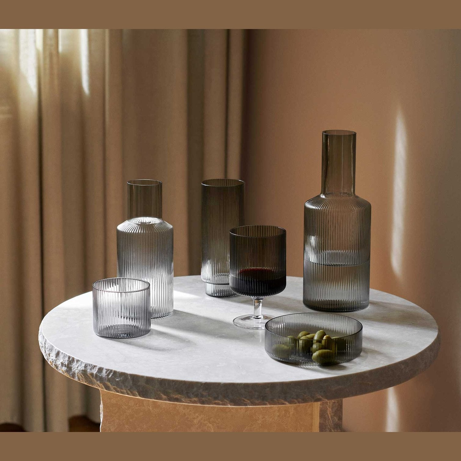 Munnblåst inn i formen, har denne praktiske og vakre karaffelen et kruset design for et moderne utseende. Fyll med vann, juice eller favorittdrikken din og hell i det matchende settet med glass for en stilig måte å servere på.