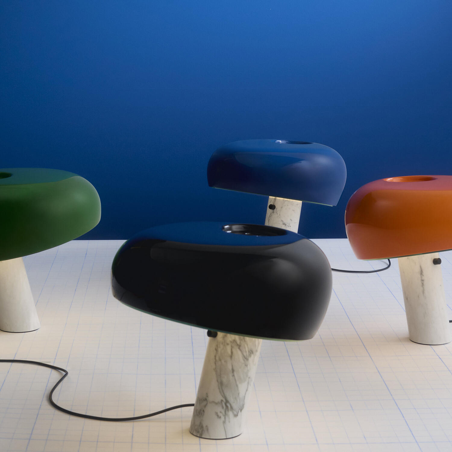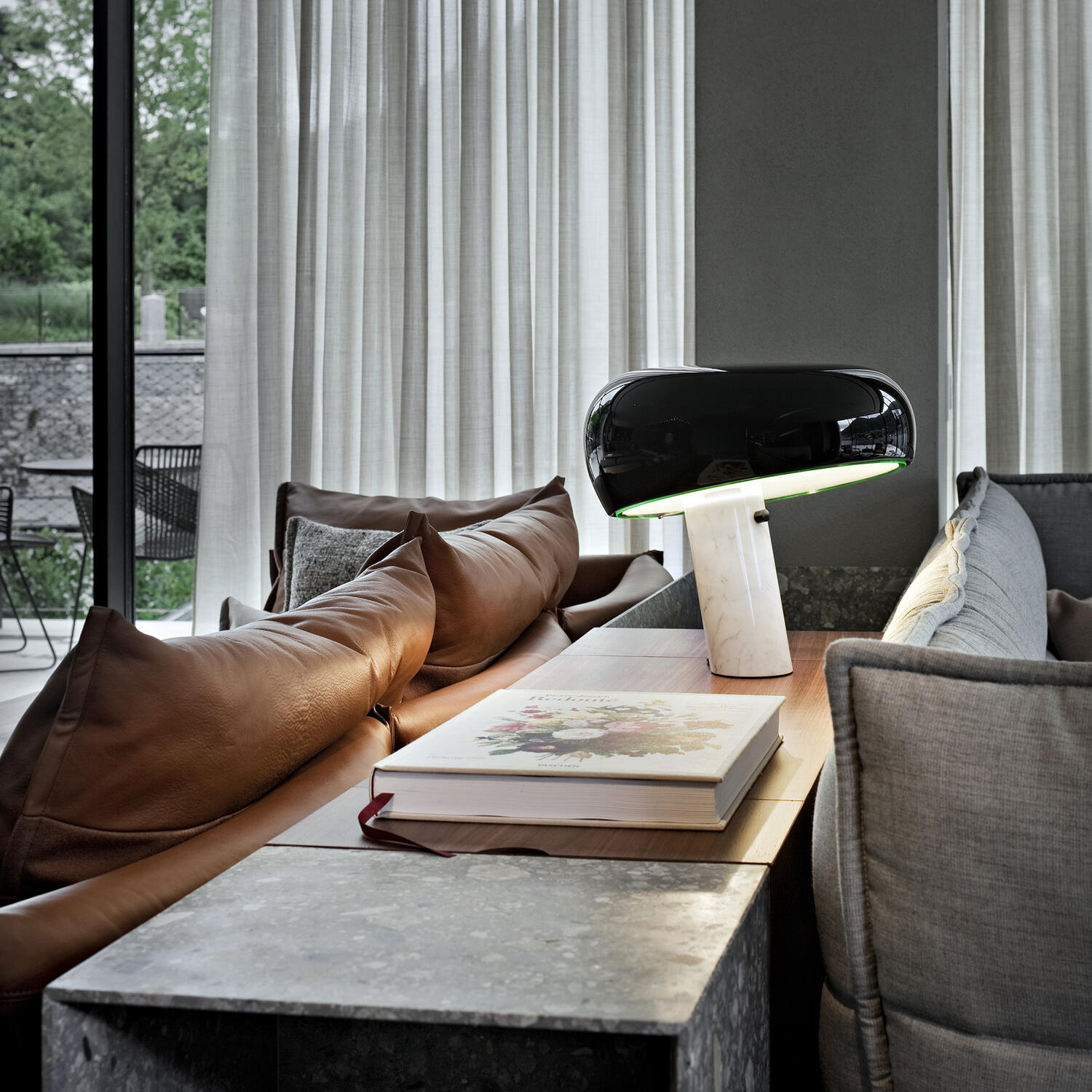 Bordlampe som gir direkte lys med emaljert metallreflektor og hvit Carrara-marmorbase. Den ble designet av Achille og Pier Giacomo Castiglioni i 1967.