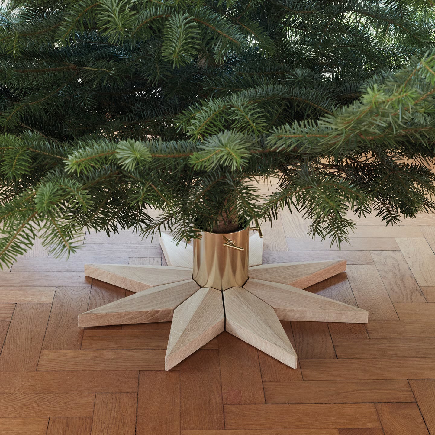 Stella er en flot stjerneformet juletrefot i tre . Messingbelagt stål basen holder tre stabilt med hjelp av 4 scruer . Beloder har nok plass til å fylle med vann .
