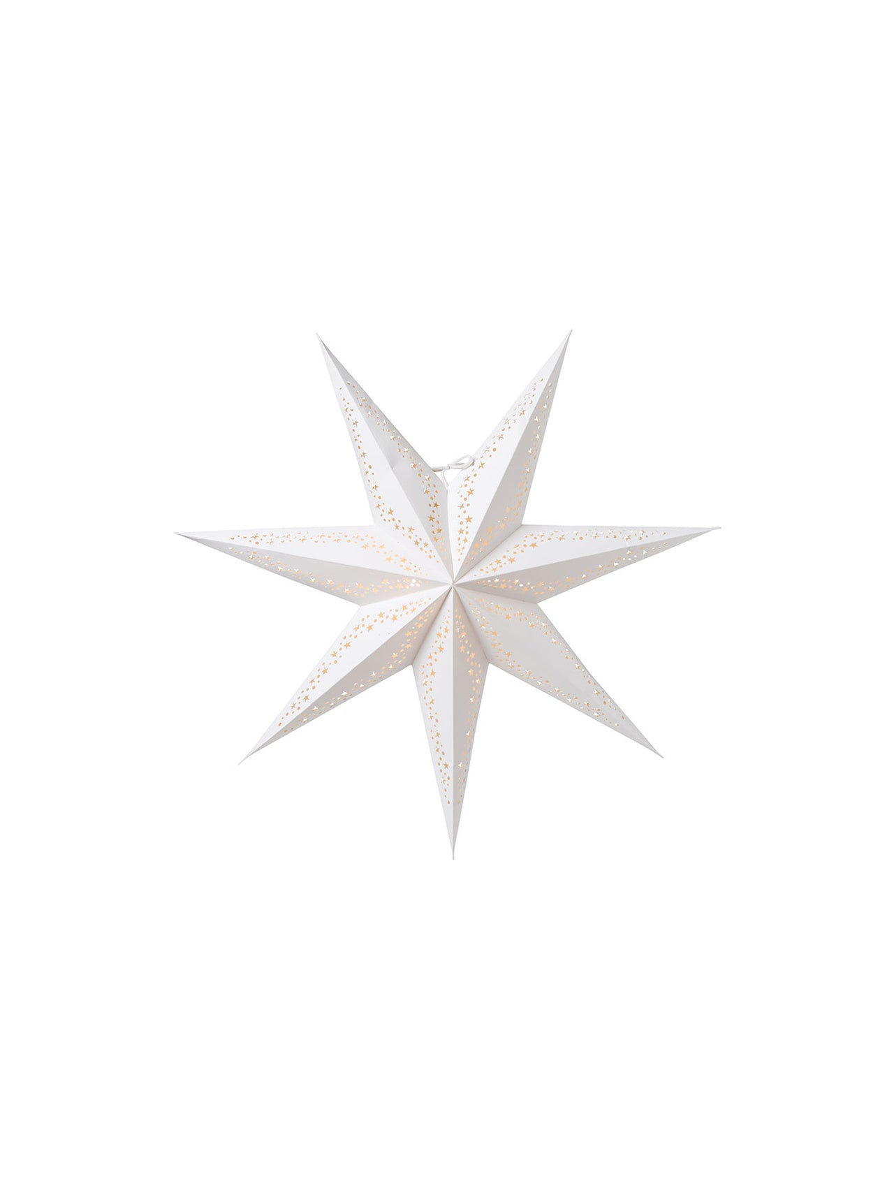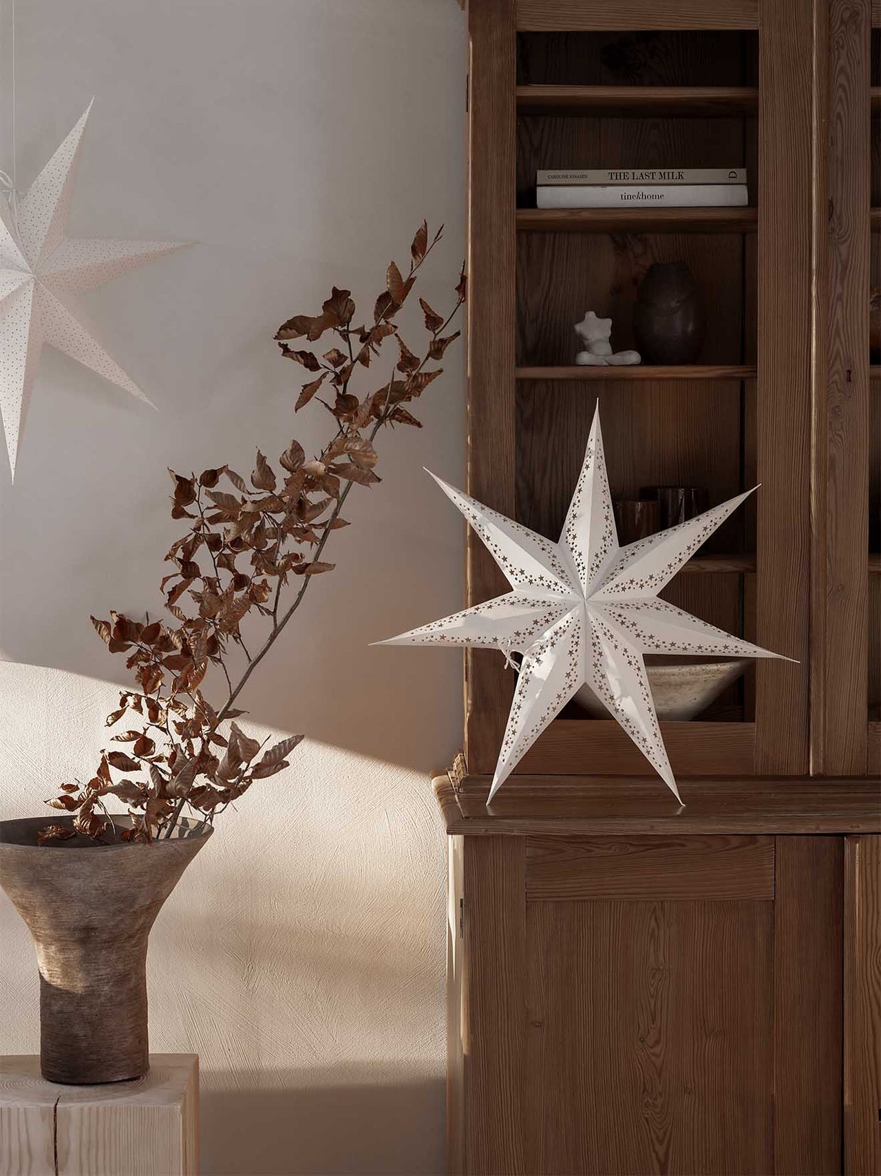 Vintergatan 60 – en håndlaget, hvit papirstjerne med nydelige detaljer. Når den tennes, lyser de små stjernene opp som Melkeveien og skaper en varm og magisk stemning. Laget i et materiale som tåler det nordiske klimaets skiftende temperaturer – perfekt for både inne- og utebruk.